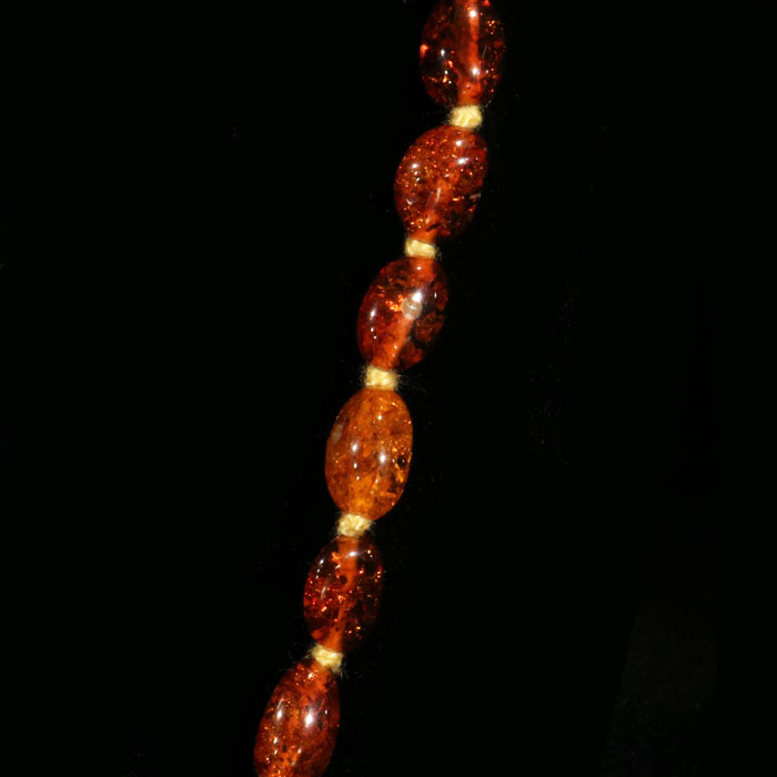Geknüpfte Kette mit ovalen, zulaufenden Nuggets (à 7-11 mm) aus durchscheinendem Bernstein in dunkler oranger Farbe. Die Kette ist ca. 66 cm lang und hat ein Silberverschluss.