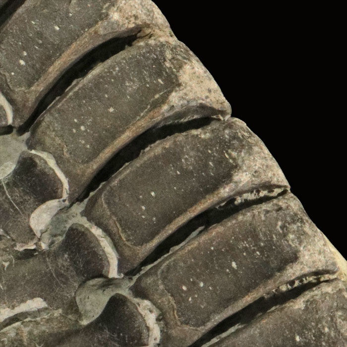Ein eindrückliches Schaustück aus der weltberühmten Fossilienregion an Englands Südküste: 10 Rückenwirbel eines Ichthyosauriers in Serie, in grossartigem Detail erhalten und sehr gut präpariert. Ein weiterer Wirbel liegt am Ende auf und zudem befindet sich ein kleiner Ammonit in der Mitte des Stücks.