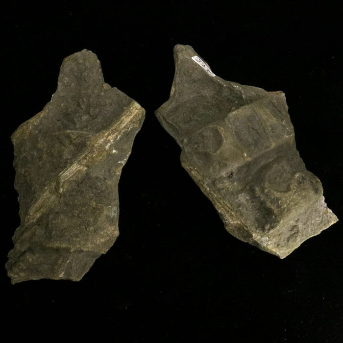 Paläontologisch interessantes Stück, auch fürs Auge attraktiv: 2 Rückenwirbel eines Ichthyosaurus, welche (wie auch Teile der Matrix) pyritisiert sind. Dieses Stück wurde in der Mitte halbiert und poliert, so dass die Feinstrukturen noch besser zu sehen sind.