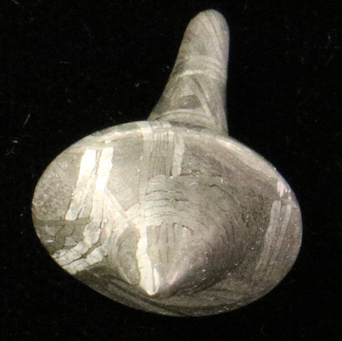Ein Kunststück der Steinverarbeitung: Ein Kreisel, geschliffen aus dem Eisennickel-Meteoriten von Muonionalusta, Schweden. Mit schönen Widmannstättenschen Figuren.