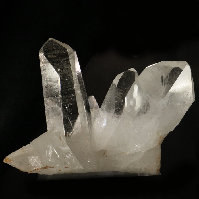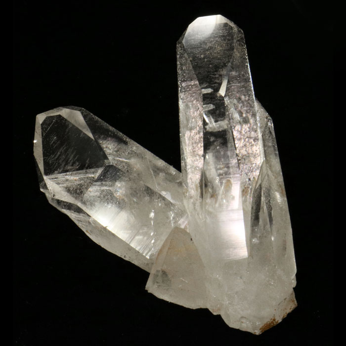 Die Doppelender sind schön intakt, einzig rechts der Mitte und am unteren Rand befinden sich Bruchstellen. Solche "Herkimer-Gruppen" sind sehr selten - die Kristalle werden lose in den Drusen gefunden, sie müssen also repariert werden, so auch diese Gruppe.