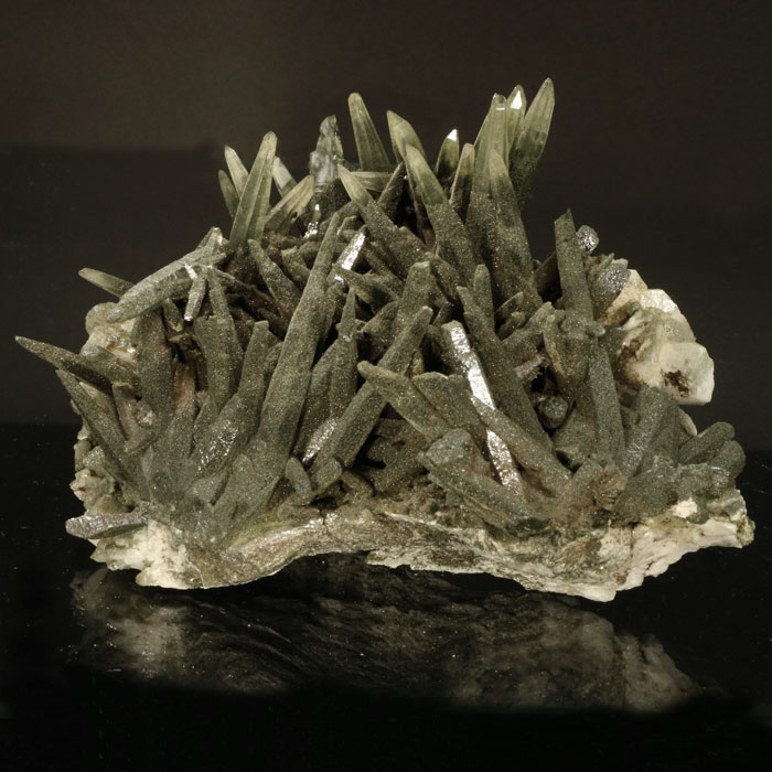 Ein ganz besonderes Stück: Nadeliger Bergkristall, mit dichten Chlorit-Einschlüssen, aber meist klaren Spitzen, als schöne Gruppe auf Matrix und mit etwas Albit.