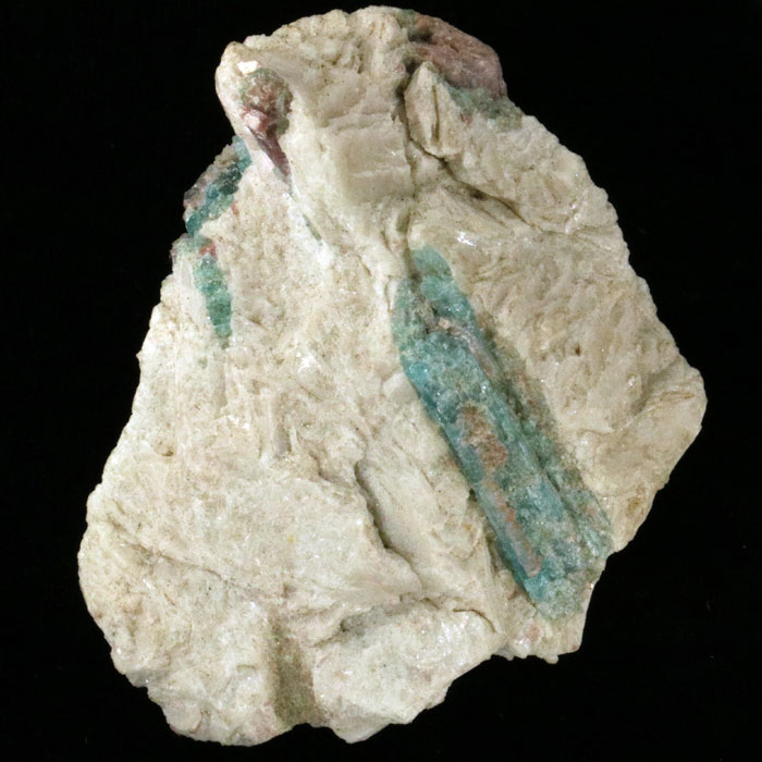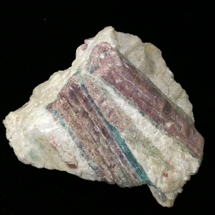 Handliches Rohstück mit Paraiba-Turmalin in Teilkristallen, eingewachsen in Feldspat-Matrix. Das Stück enthält 3 grössere Individuen, wovon eines fast nur rosaviolett ist, eines rosa mit türkisfarbenem Rand und eines vor allem die begehrte Türkisfarbe zeigt.