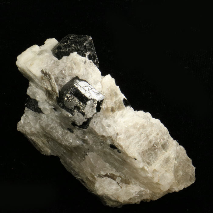 Kleine hübsche Stufe mit doppelendigen Schörl-Kristallen bis etwa 1 cm Länge mit glänzenden, blättrigen Muskovit-Kristallen in Quarzmatrix. Das Besondere daran: Sie stammt aus den Südalpen, genauer: von Olgiasca am Comersee, wo einige Pegmatite mit Turmalin bekannt wurden.
