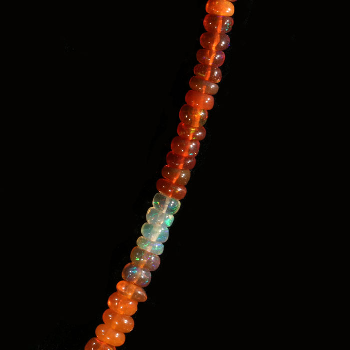 Elegante Kette mit zulaufenden Rondellen (à 3-5 mm) aus Feueropal in verschiedenen, kräftigen Orange-tönen, zwischendurch auch immer wieder Edelopal-Rondellen mit schönem Farbspiel.