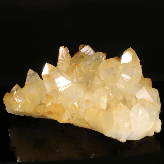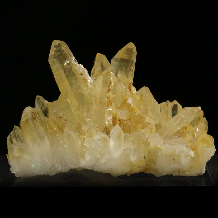 Ausgesprochen feingliedrige, ästhetische Bergkristall-Gruppe, durch einen feinen Belag von Limonit mit attraktivem goldenen Farbton.