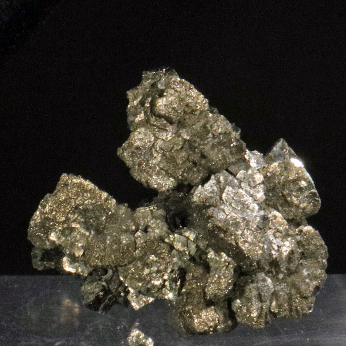 Für Schweizer Verhältnisse höchst bemerkenswerte Pyrit-Stufe, welche nur aus aneinandergewachsenen, stak verzerrten Würfel besteht. Guter Glanz.