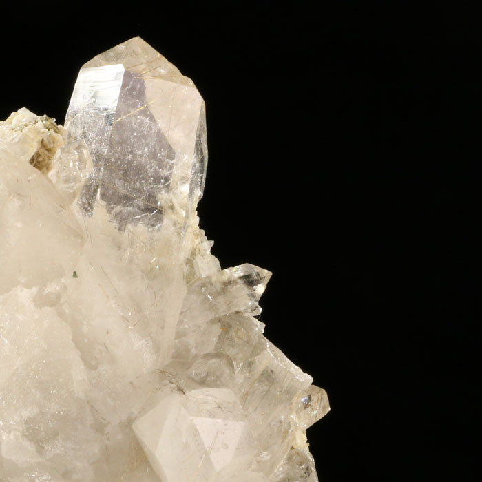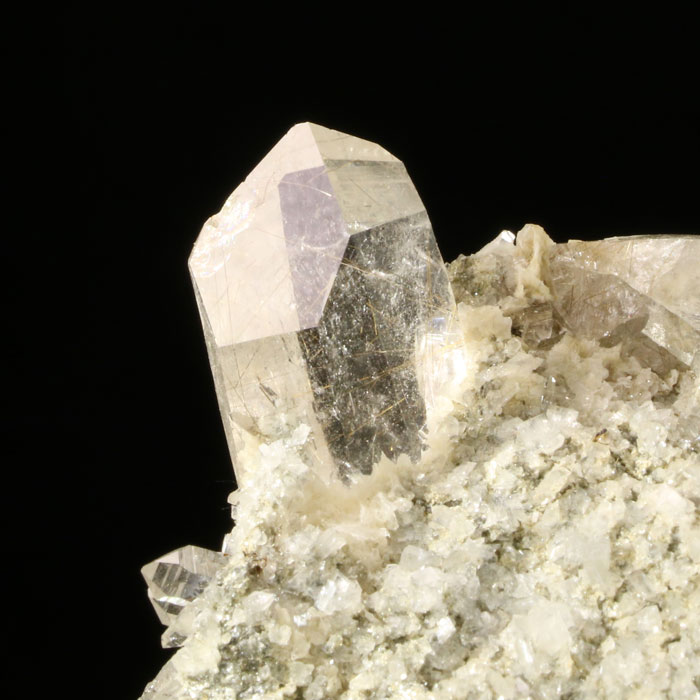Der Rutil ist golden und fein im Bergkristall verteilt (darum auf den ersten Blick nicht ganz offensichtlich). Eine Seite der Stufe ist mit feinen Adular-Kristallen übersät.