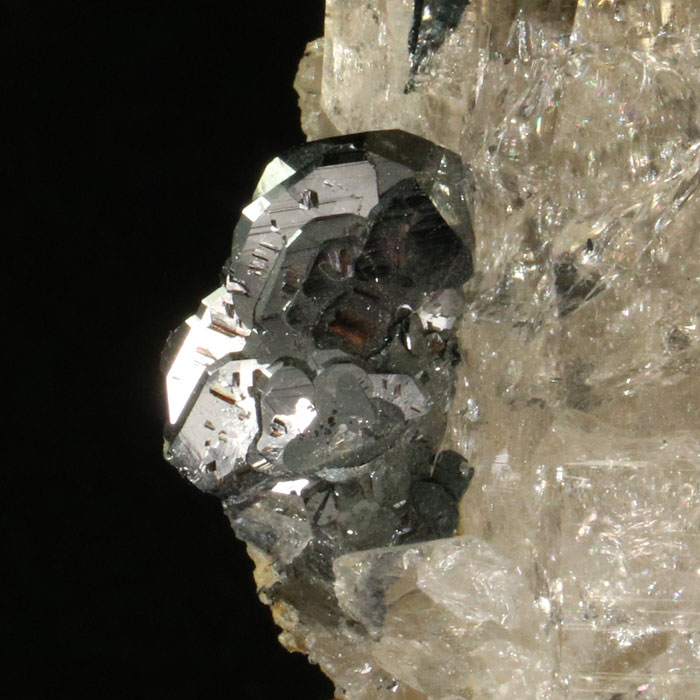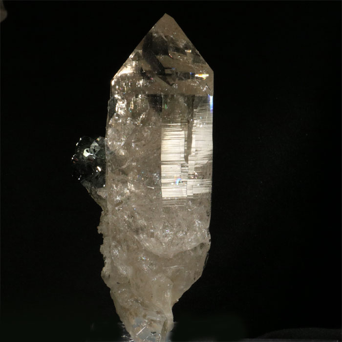 Hochglänzender, intakter Rauchquarz von sehr heller Farbe, dem seitlich eine ebenso glänzende Hämatit-Rosette aufsitzt. Ein Klassiker aus der Cavradi-Schlucht. Die Rückseite besteht aus einer fein verheilten Bruchstelle.