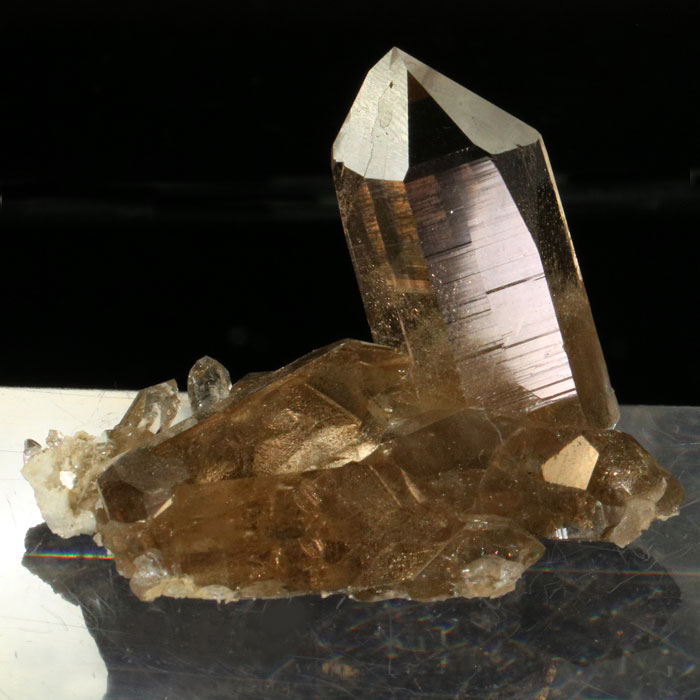 Kleine erlesene Rauchquarz-Stufe mit perfektem, dominantem Kristall, sehr klar, hochglänzend und intakt.