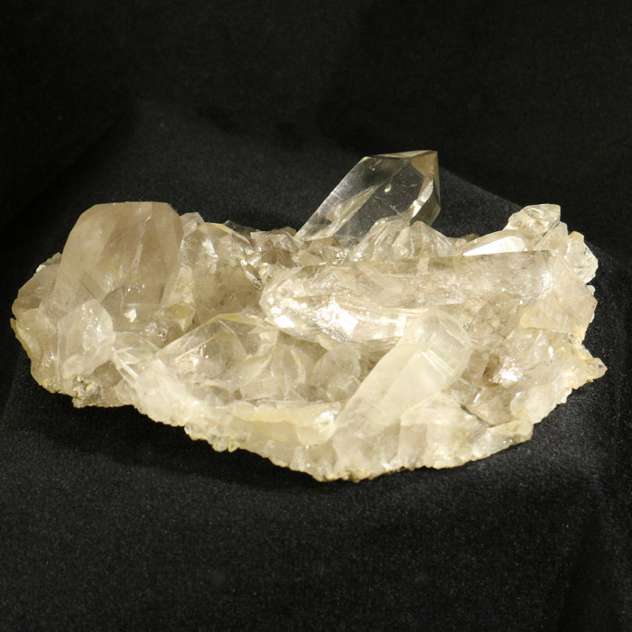 Helle Rauchquarz-Stufe von 11 cm Breite, 10 cm Tiefe und ca. 4 cm Höhe, mit vielen Spitzen, welche alle intakt sind, sehr guten Glanz zeigen und teils schön klar sind. Leicht wilde Anordnung.