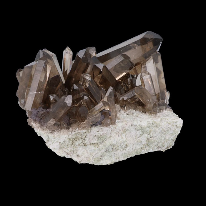 Eine der Rauchquarz-Stufen, für welche die Rufibach-Kluft am Zinggenstock berühmt wurde: schlanke, glänzende Kristalle, dunkle Farbe und heller Granit als Basis.