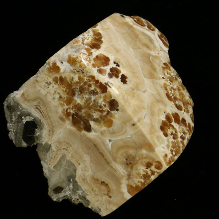 Der Aragonit bildet beige Lagen von schöner Textur, der Calcit liegt als bernsteinfarbene, durchscheinende Körner vor.