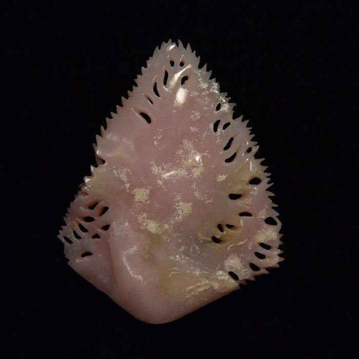 Meistervoll und mit viel Liebe zum Detail geschliffener Shiva aus rosa Andenopal (mit kleinen Dendriten z.B. an der Spitze seines Haarknotens). Die Farbe des Andenopals ist nicht einfach einzufangen und ist in echt mehr Kaugummi-Rosa. Auf der Rückseite ist das Stück jedoch weniger intensiv wie auf der Vorderseite und hat ein paar gelbliche Stellen.