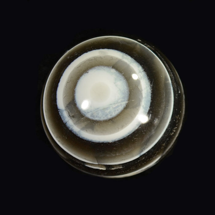 Ganz spannende Kugel aus Owyhee-Opal. Dieser himmelblaue Opal mit schwarz-weisser Zeichnung zeigt hier eine wundrschöne Bänderung, welche die Kugel von der einen Seite wie ein Auge aussehen lässt.