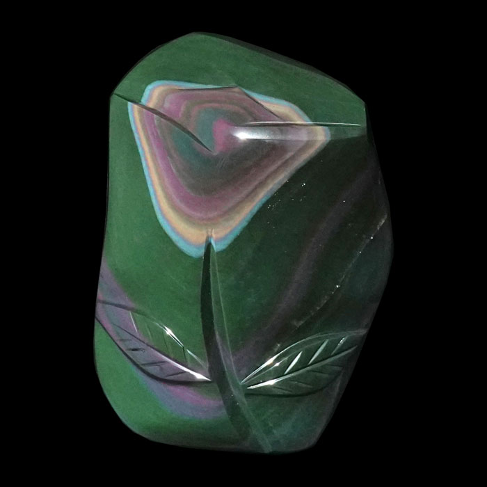 Ovaler Handstein aus Obsidian mit schönem Schiller auf einer Seite, der in dieser Farbe auch Silber-Obsidian genannt wird.