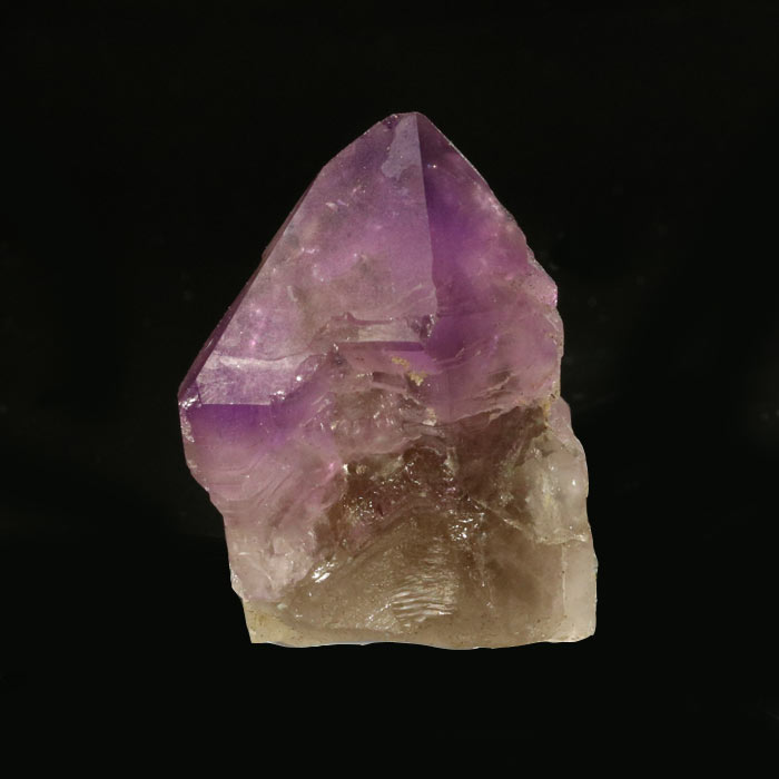 Amethyst-Spitze mit - für Schweizer Verhältnisse - selten intensiver lila Farbe. Die Spitze ist 4 cm lang und zeigt den typischen zepterartigen Wuchs von Amethyst auf einer hellen Rauchquarz-Basis.