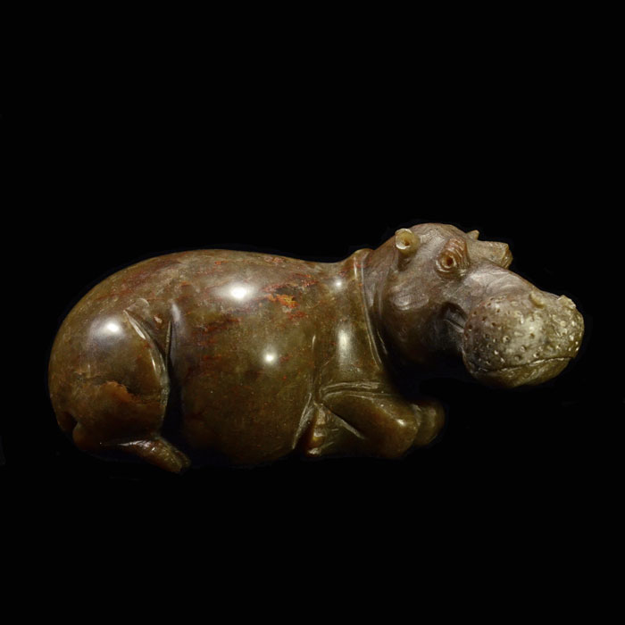 Elefant aus Eisenjapsis von kräftiger Farbe und spannender Musterung mit Eisenbänderung (Hämatit), welche vor allem auf dem Kopf, Rücken und Bauch sichtbar ist.