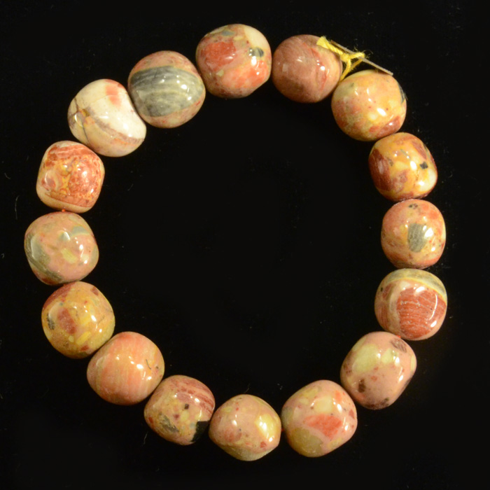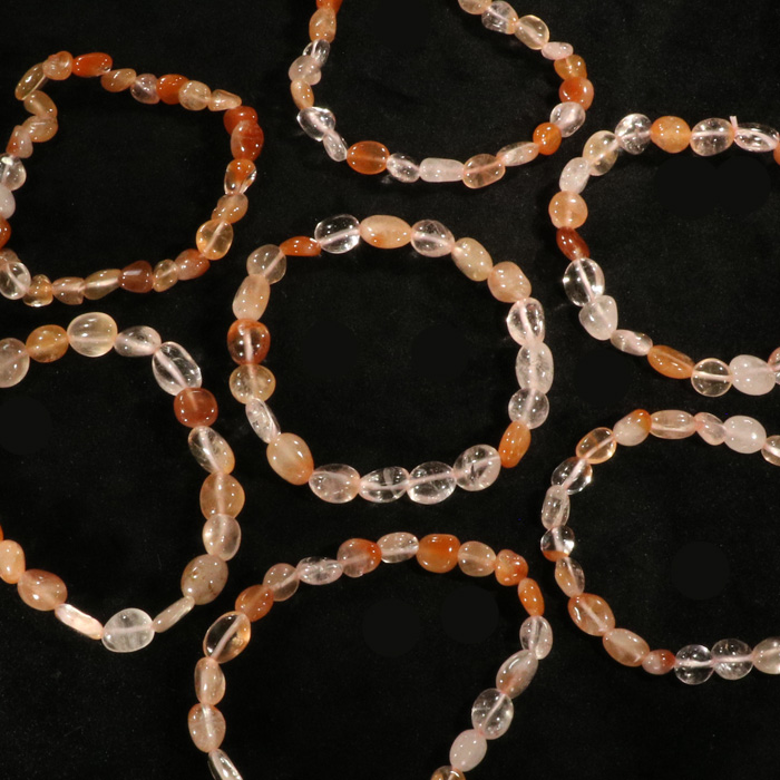 Sieht man nicht alle Tage: Gerundete, polierte Kunzit-Splitter, meist deutlich rosa, in einem schön verarbeiteten Armband.