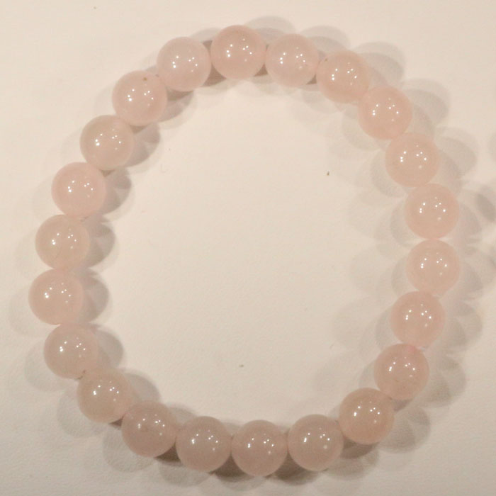 Rosenquarz von durchschnittlich guter Farbe als Armband mit Kugeln von 8 mm Durchmesser.