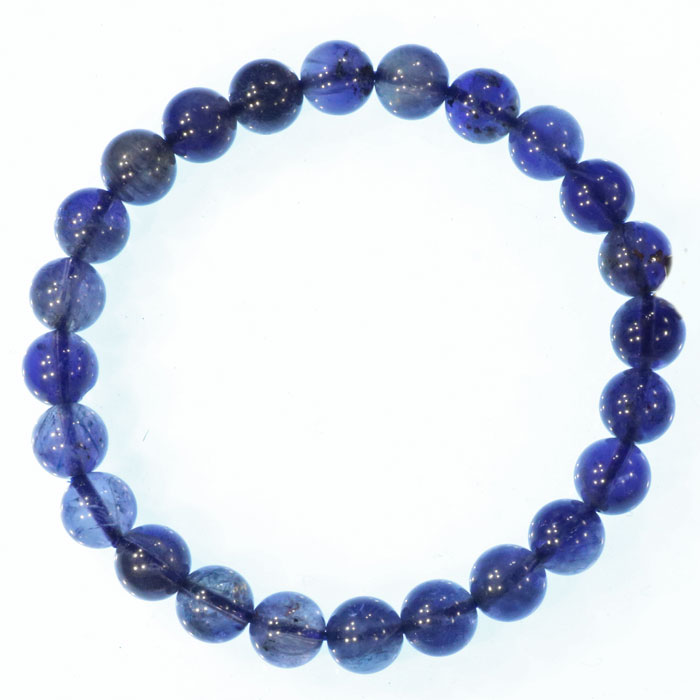 Der gar nicht so häufige Cordierit als Armband mit durchsichtigen Kugeln von 8 mm, die den starken Pleochroismus des Cordierit schön zeigen: je nach Blickrichtung ist der dunkelblau, hellblau oder beige.