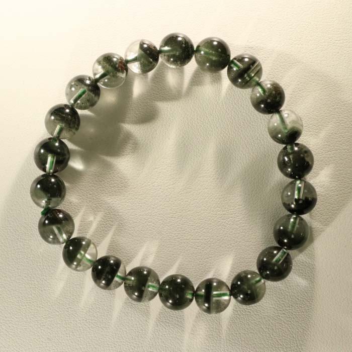 Aussergewöhnliches Armband mit Kugeln aus trübem Quarz mit Dumortierit-Einschlüssen in dunklerem Blau, teilweise erscheinen die Einschlüsse nadelartig. Die Kugeln haben einen Durchmesser von ca. 9 mm und sind auf einem stabilen Gummiband aufgezogen.