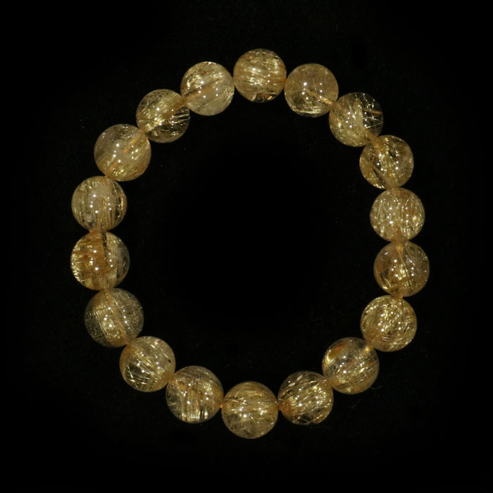 Spektakuläres Armband mit Kugeln aus hochqualitativem Rutilquarz mit goldenen, strahlenden Rutilnadeln, welche für einen schönen Glanz sorgen. Die Kugeln haben einen Durchmesser von ca. 8 mm und sind auf einem stabilen Gummiband aufgezogen.