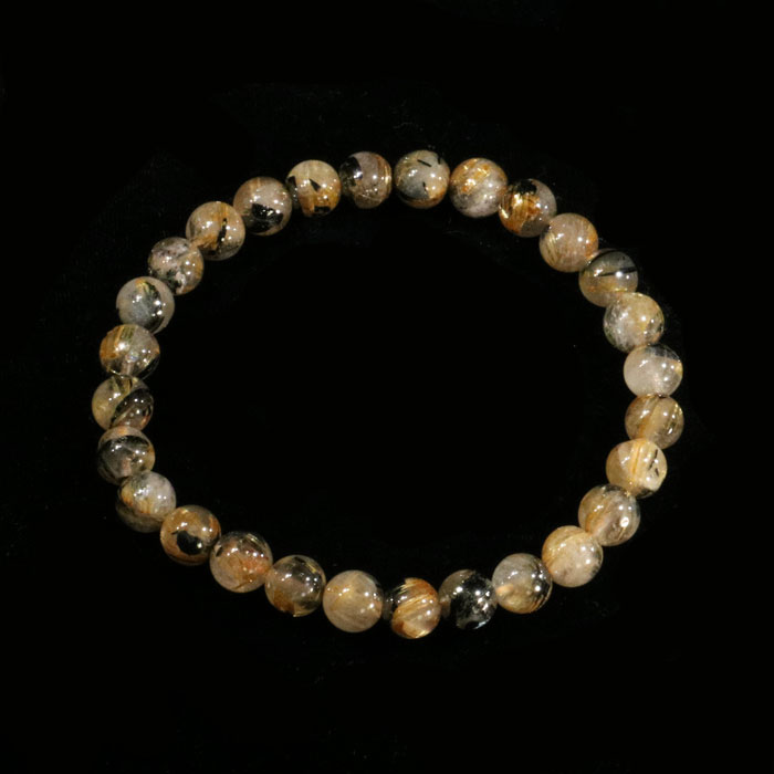 Aussergewöhnliches Armband mit Kugeln aus Rutilquarz und Hämatit. Die goldenen Rutil-Nadeln und dunklen Hämatit-Einschlüsse sind gut erkennbar. Die Kugeln haben einen Durchmesser von ca. 6.5 mm und sind auf einem stabilen Gummiband aufgezogen.