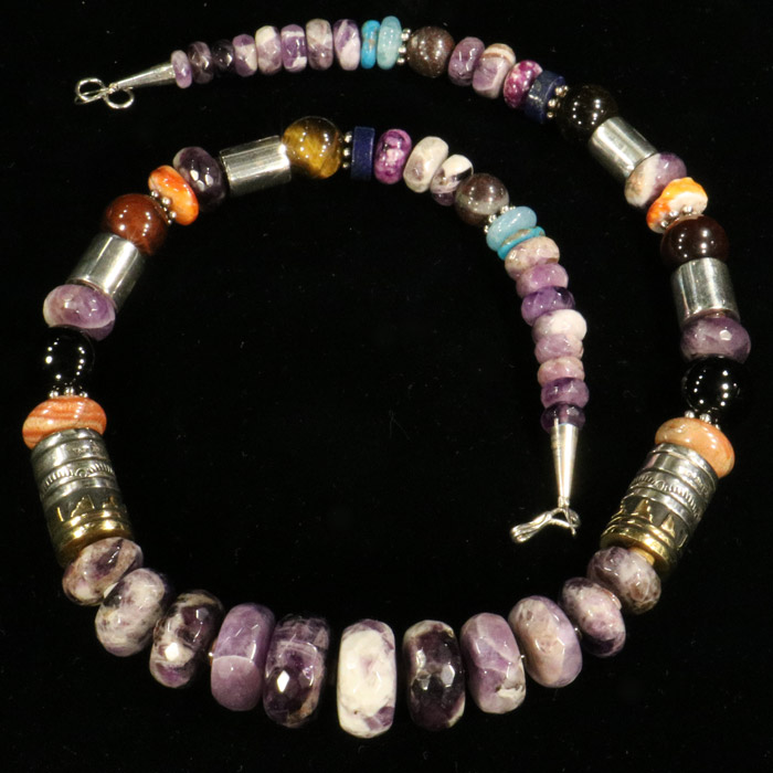Eine Halskette, welche zeigt, dass Indianerschmuck auch moderner und frecher sein kann: diverse gemischte Schmucksteine (Amethyst, Perlmutt, Tigerauge, Türkis, Sugilith, Koralle; Lapislazuli, Aquamarin) und Sterling-Silberglieder als bunte aber harmonische Halskette von 54 cm Länge. Durchmesser der Kugeln und Glieder bis 18 mm.
