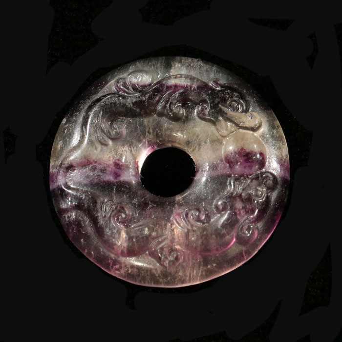 Eine Pi-Scheibe einmal anders. Schön gebänderter Fluorit, wie er typisch ist aus der Provinz Xhejiang, hinten flach und vorne mit einer hübschen, stilisierten Gravur mit Drachen- und Kugelmotiv!