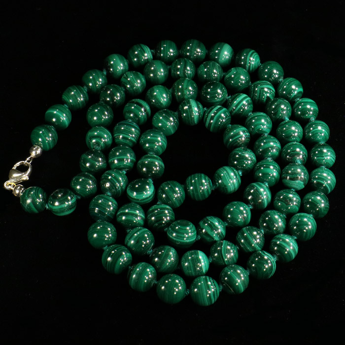 Kugelkette aus wunderschönem Malachit in Topqualität, in seinen typischen Grüntönen. Die Kette ist auf Perlseide aufgezogen und nach jeder Perle geknüpft, was die Kette besonders stabil macht. Durchmesser der Perlen: 10 mm. Schliesse aus 925er Silber, eignet sich somit zum doppelt oder auch einfach tragen. Gesammtlänge: 89 cm.