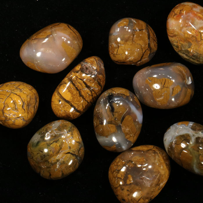 Die Trommelsteine hier haben eine deutliche Farbzonierung und einen sanften Schiller dank den Einschlüssen.