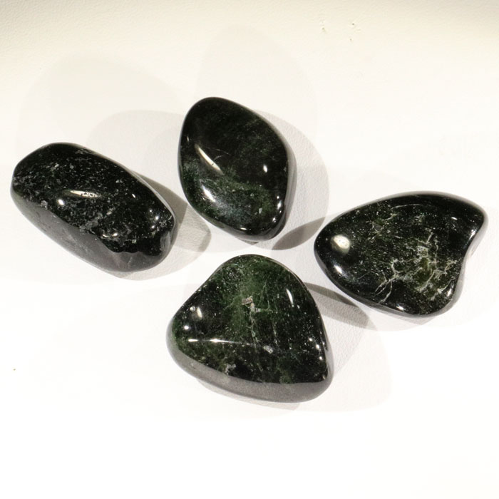 3.5 bis 4.5 cm grosse Trommelsteine aus Silver Leaf (Silberblatt) Jaspis. Beim Silver Leaf Jaspis handelt es sich um eine Jaspis-Brekzie, welche farblich von weiss, beige, grau bis hin zu schwarz reicht, im Gegensatz zu der bekannteren Jaspis-Brekzie in Rot- und Brauntönen.