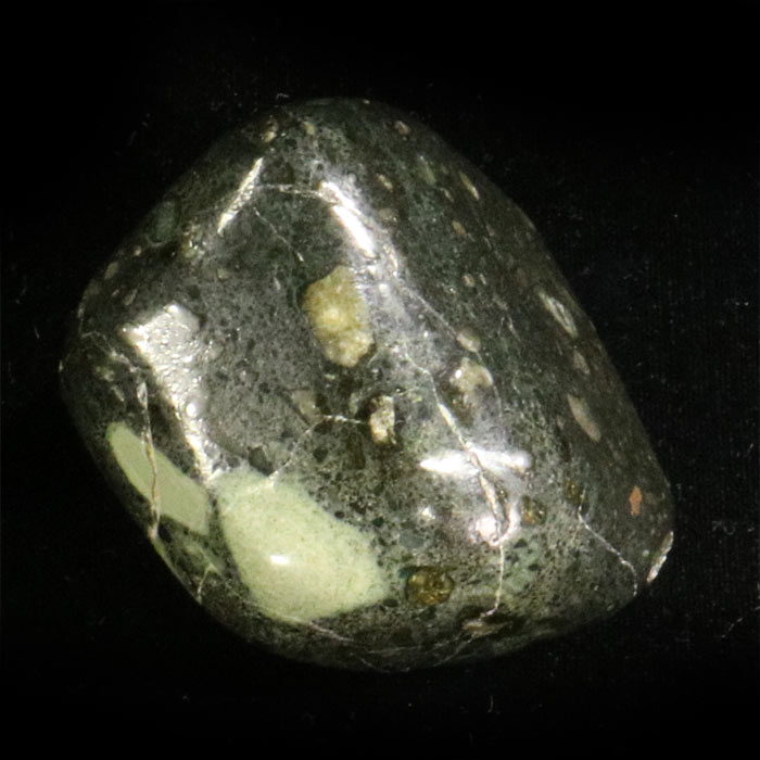 Als Trommelstein eine Rarität, als Gestein hochinteressant: Kimberlit, das Diamant-Trägergestein, aus einer südafrikanischen Diamant-Mine als grosser Trommelstein von 5x4 cm.