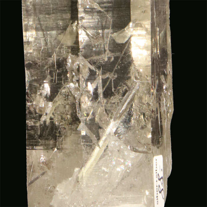 Eine seltene Spzailität aus den Schweizer Alpen: helle Rauchquarz-Spitze von 10 cm Länge, welche mehrere gut sichtbare Hohlkanäle zeigt. Bei diesen Kanälen handelt es sich um ehemalige Anhydrit-Kristallnadeln, welche sich in Oberflächennähe aufgelöst haben.