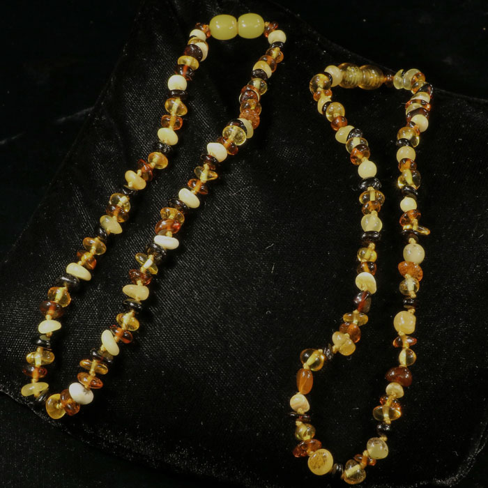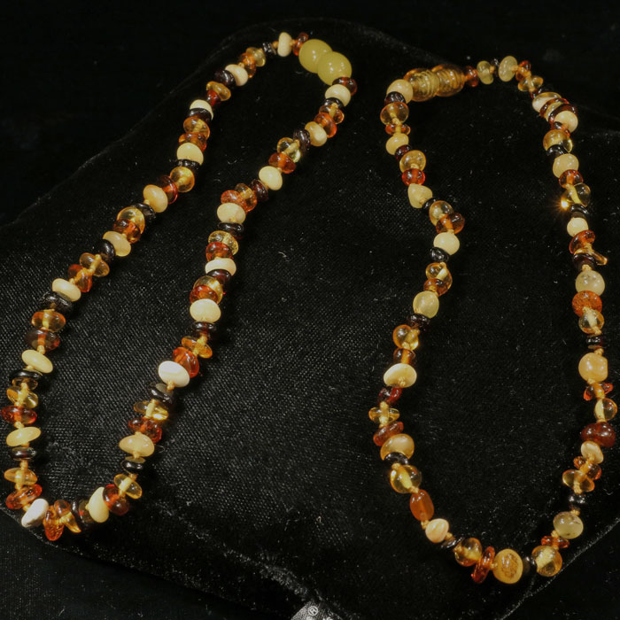 Babykette aus mehrfarbigen, polierten Bernstein-Splittern mit Drehverschluss. Etwa 32 cm lang.
