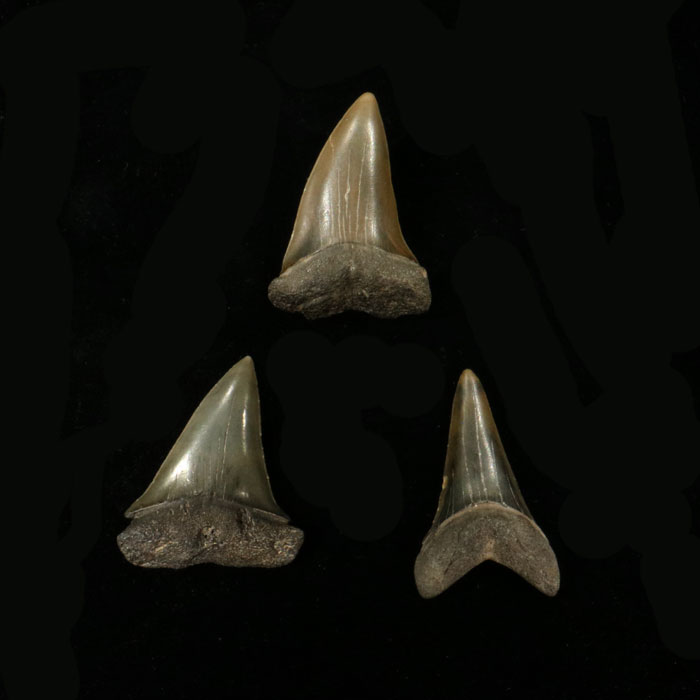 Schön erhaltene Haizähne des Megalodon, ca. 4.5 cm lang und 3 cm breit.