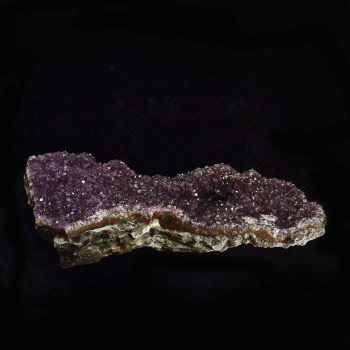 Grosse, schöne Amethyst-Stufe (Drusenstück) aus kleinen, intensiv violetten Amethyst-Kristallen. An der Seite ist eine schöne braun-rote Bänderung erkennbar.