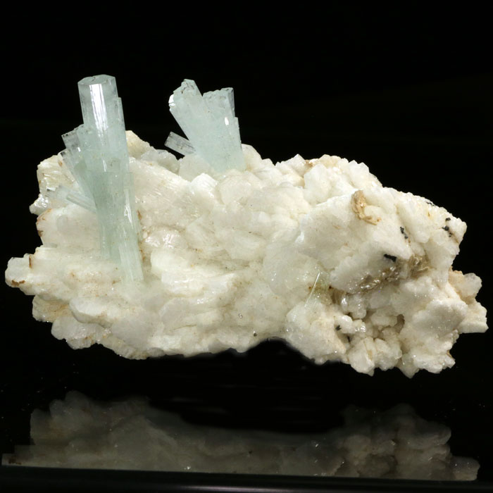 Feingliedrige, hübsche Stufe mit feinen, sehr schlanken Aquamarin-Kristallen von zartem Hellblau auf weissem Albit. Die Kristalle bilden eine Art Büschel, sind bis 2.5 cm lang. Sie zwar nicht durchsichtig, aber völlig intakt.