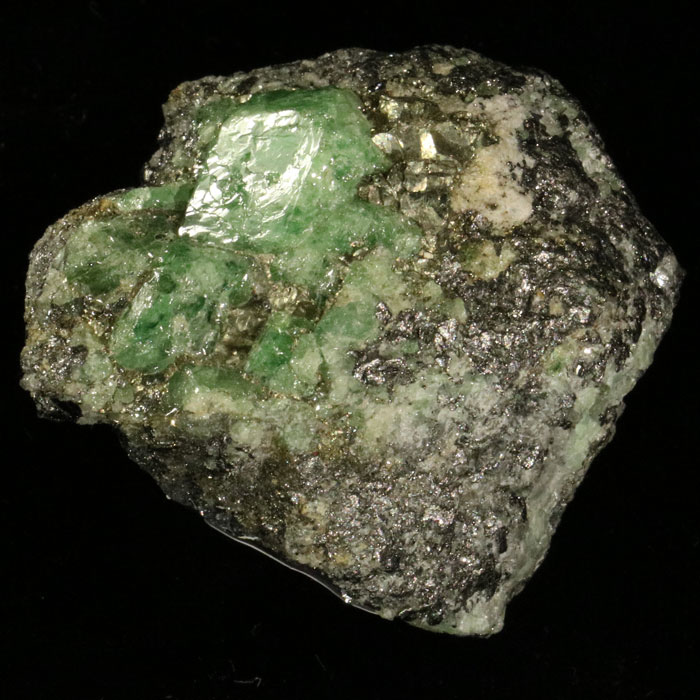 Ein rund 1 cm grosser, gut ausgebildeter Tsavolith-Kristall mit kleineren Begleitkristallen, eingewachsen in einer Matrix aus Pyrit, Graphit und derbem Granat. Schönes Belegstück für diese seltene und begehrte Granat-Varietät aus Ostafrika.