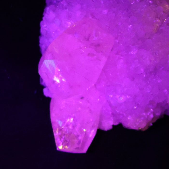 Sehr attraktive, grosse Stufe mit hochglänzenden, durchsichtigen und unversehrten Calcit-Kristallen, die auf einem Rasen von kleineren, weisslichen Calciten aufsitzen. Das ganze Stück fluoresziert sehr schön rosa im langwelligen UV-Licht!