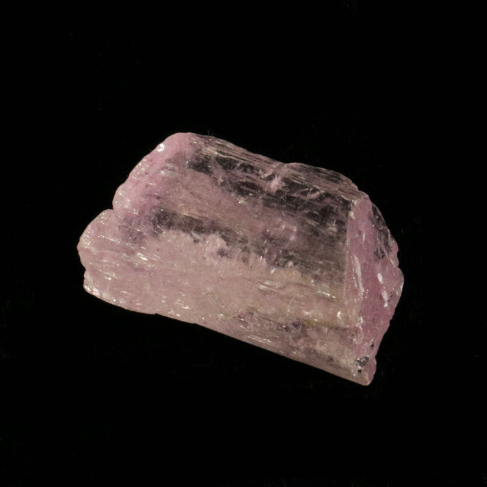 Solider Kunzit-Kristall in hellrosa Farbe, mit einigen Bruchstellen und leichter, aber typischer, oranger Fluoreszenz unter UV-Licht. Das Stück misst ca. 3x1.8 cm.