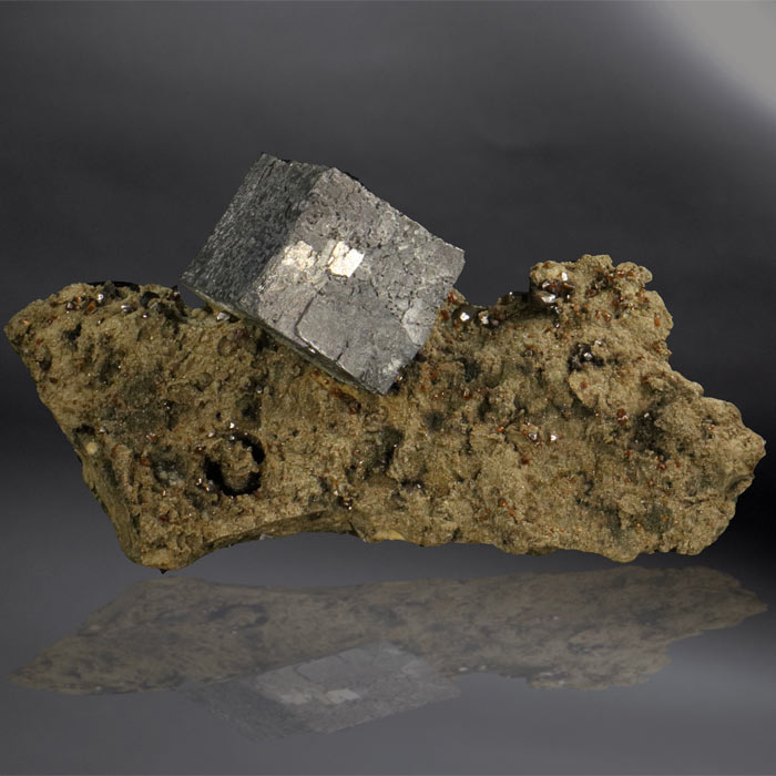 Wunderschön arrangiert von der Natur: Bleiglanz-Würfel, begleitet von roter, glitzernder Zinkblende (Rubinblende) auf einem Stück kalkiger Matrix. Das Besondere daran: Unten rechts des Bleiglanzes ist ein Abdruck, resp. ein Hohlraum zu sehen, welcher von einer Turitella-Schnecke stammt!