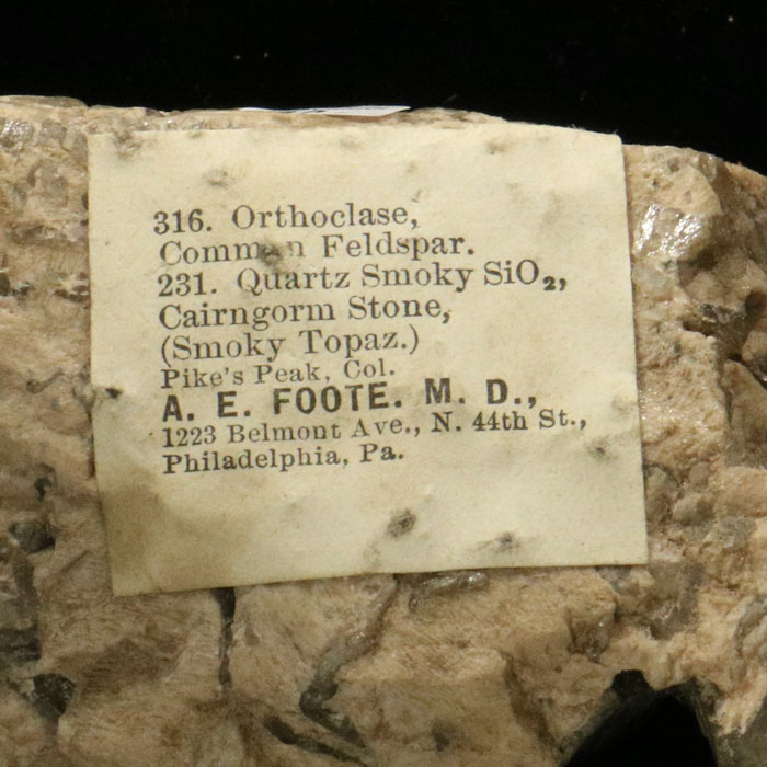 Das Besondere an diesem Stück ist die Etikette auf der Rückseite: Sie stammt vom Mineralienhändler Foote, welcher 1877-1890 in Philadelphia in den USA aktiv war.