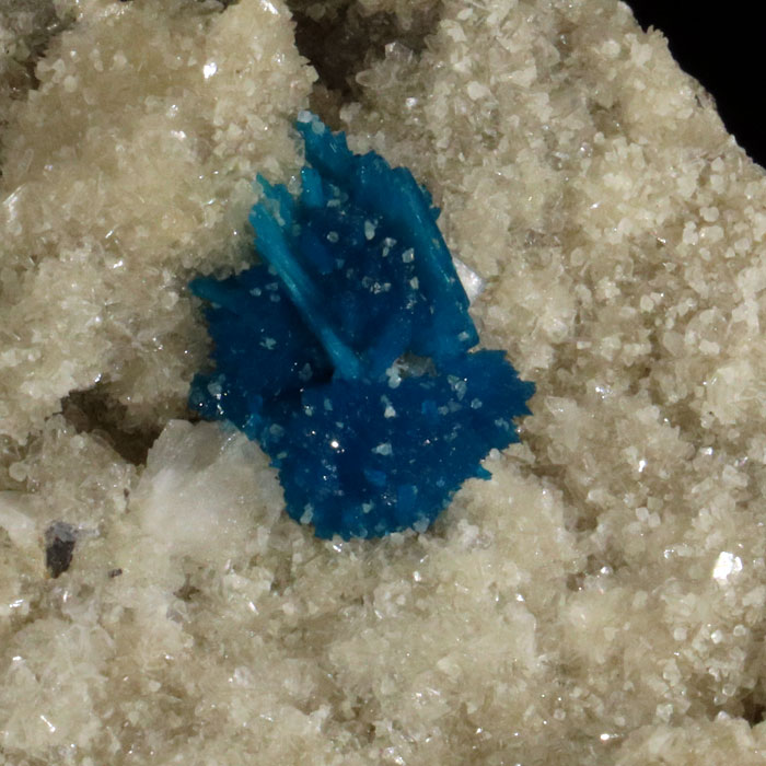 14x8 cm grosse Stufe mit einem rund 1.5 cm grossen Kristallaggregat von intensiv blaugrünem Cavansit auf einem Rasen von kleinen Desmin-Kristallen.