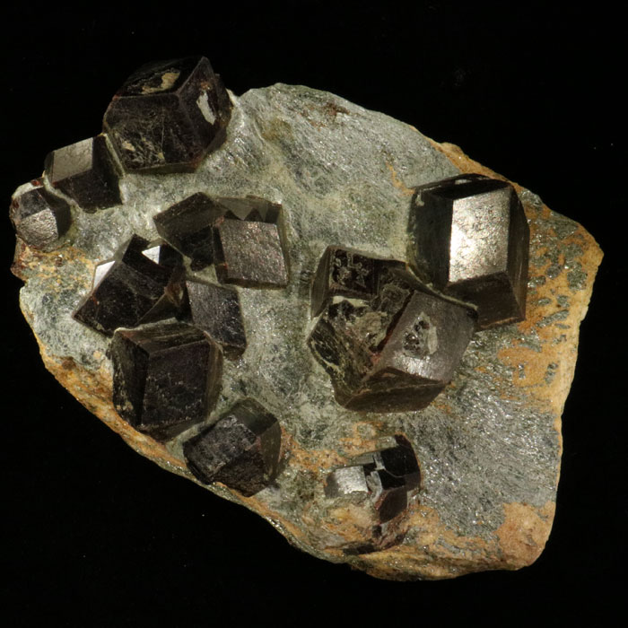 Almandin-Granat in Glimmerschiefer aus dem Oetztal ist immer wieder zu sehen, die Fundstellen sind auch heute noch aktiv. Selten allerdings sind die Kristalle so schön und scharfkantig ausgebildet wie bei diesem Stück: die Dodekaeder haben einen Durchmesser bis 4 cm, sind richtig scharfkantig und zeigen bei gutem Licht auch die typischen, roten Innenreflexe.