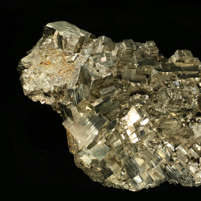 Schön aufgebaute, längliche Stufe mit intensiv gold-glänzenden, teils auch recht grossen (bis zu 2.5 cm) Pyrit-Kristallen.
