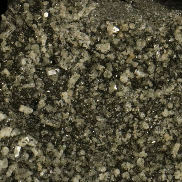 Kleine, bis 3 mm lange prismatische Nephelin-Kristalle auf einer Drusenfläche des vulkanischen Muttergesteins.