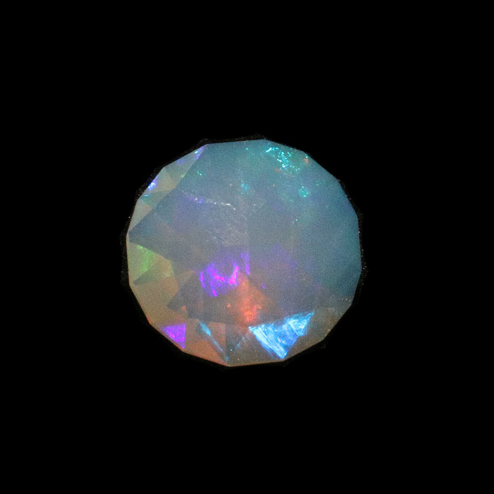 Facettierter Edelopal von relativ guter Transparenz und hervorragendem Farbspiel. Dieser facettierte Edelopal hat keine flache Tafel, sondern eine "vierblättrige", damit das Farbspiel noch mehr zur Geltung kommt.