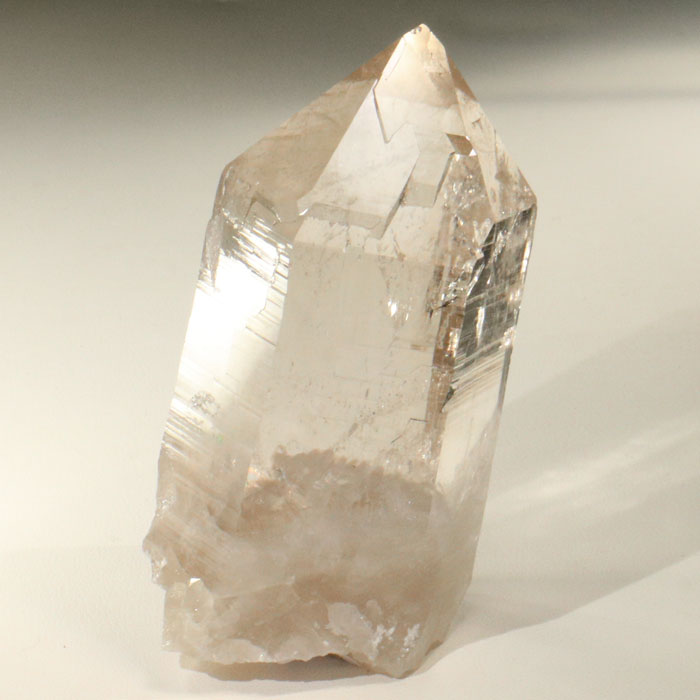 Wunderbare, ganz helle Rauchquarz-Spitze, welche tollen Glanz zeigt und mit Ausnahme der Basis auch glasklar ist.